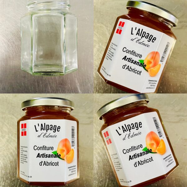 Pot de 330g. Confiture artisanale d’Abricots « l’Alpage d’Edmée ». Une attention toute particulière est apportée au remplissage des pots afin de conserver la texture du fruit.
